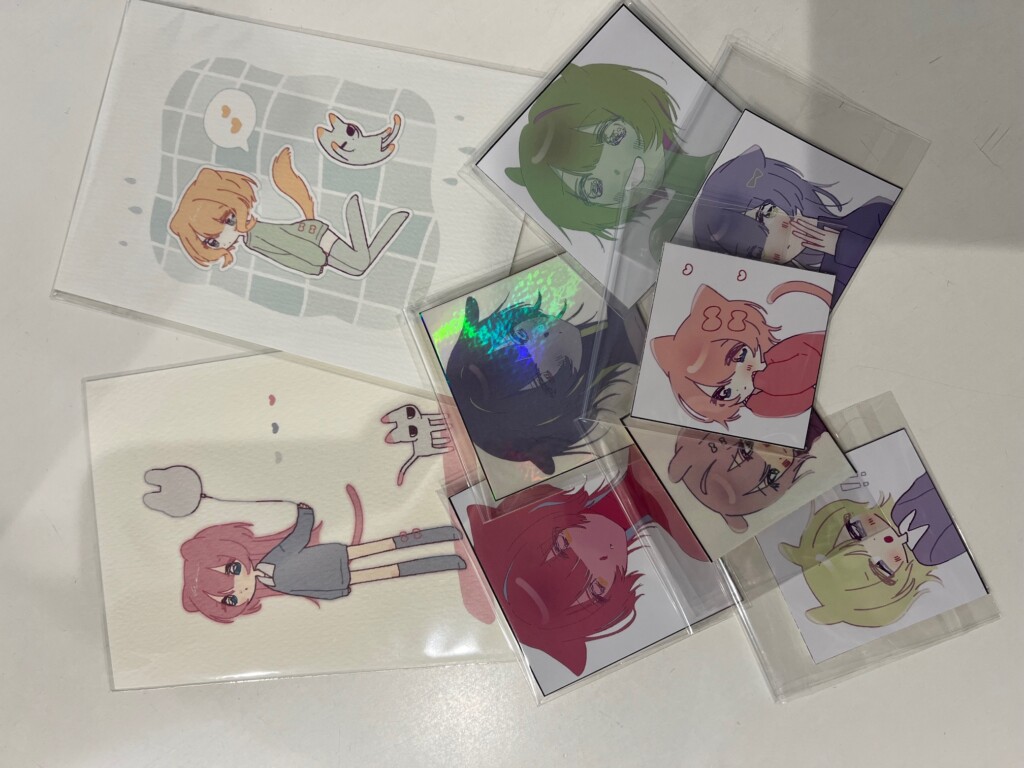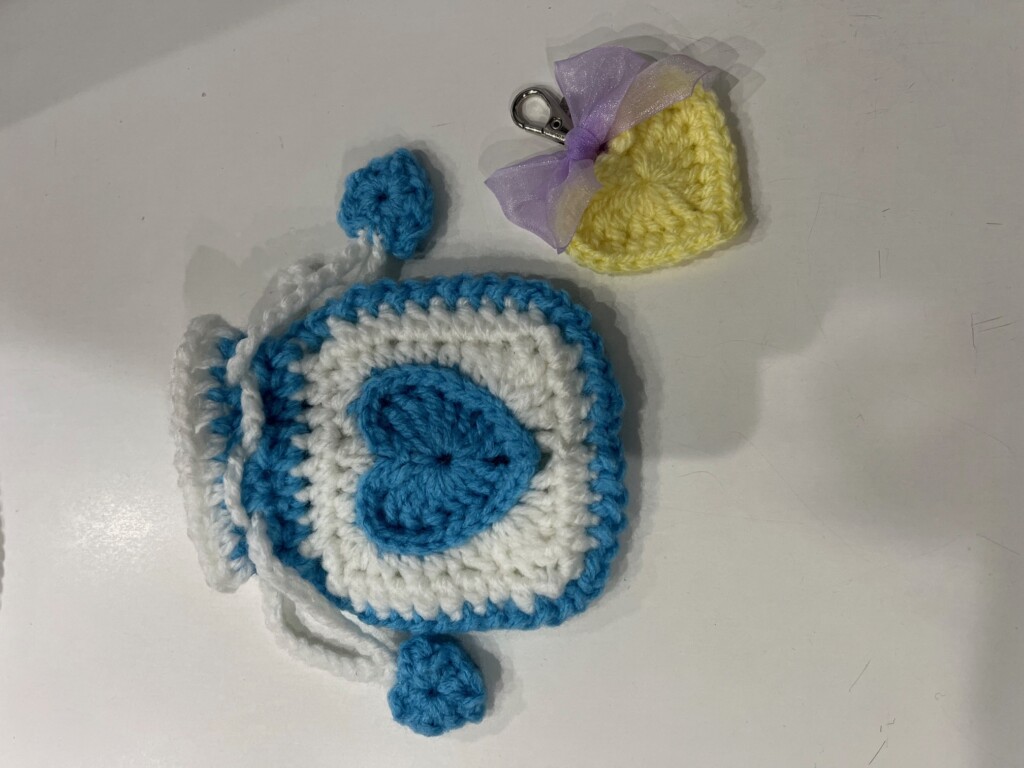 手編みのポーチとチャーム、ポストカードとステッカーです✌