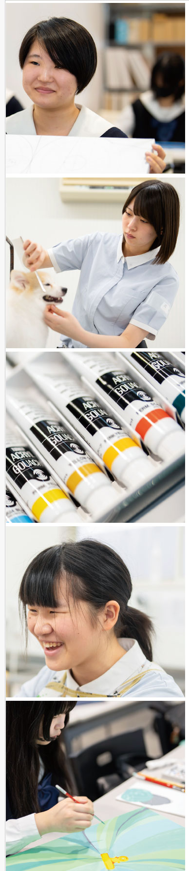 本校では、ペットとアートの専門技術や知識を基礎からしっかりと学べるだけでなく、人としての感性や豊かな情緒を育むことも大切にしています。そして、生徒一人ひとりに寄り添う丁寧な指導を全教員が心がけ、仲間とともに励まし合いながら学べる温かな場所をつくっています。