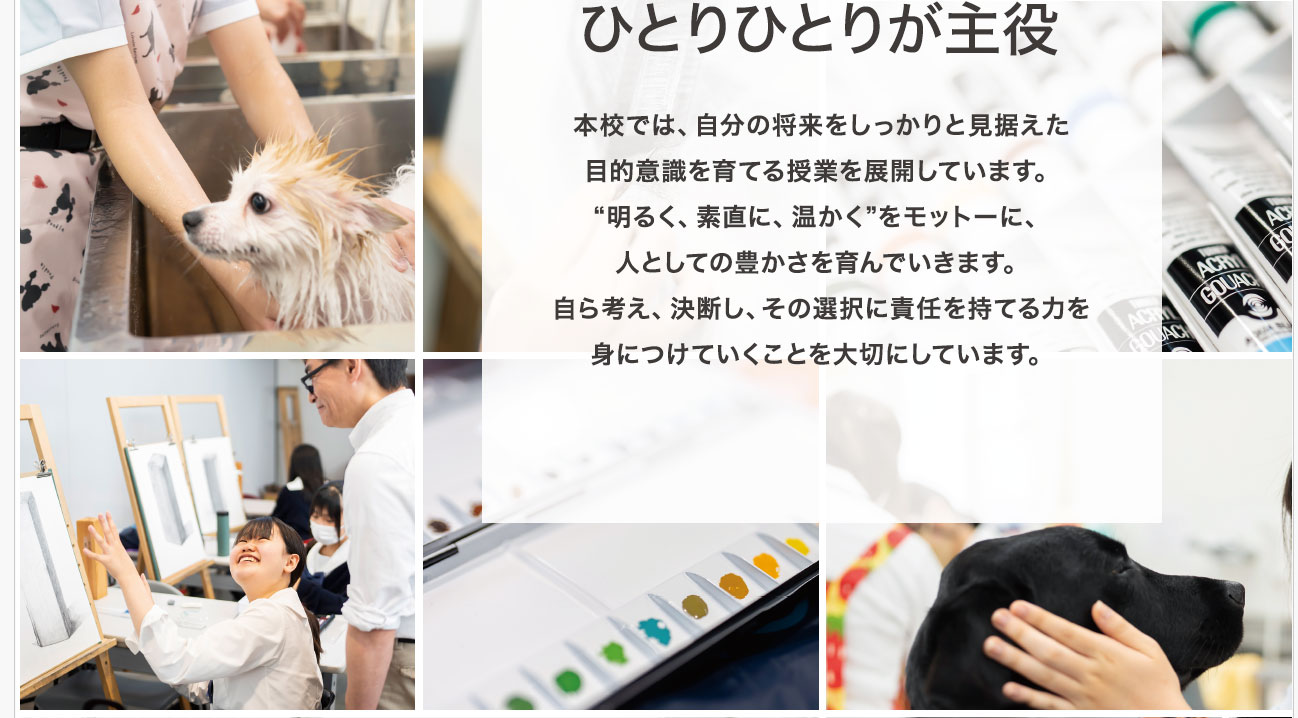 本校では、ペットとアートの専門技術や知識を基礎からしっかりと学べるだけでなく、人としての感性や豊かな情緒を育むことも大切にしています。そして、生徒一人ひとりに寄り添う丁寧な指導を全教員が心がけ、仲間とともに励まし合いながら学べる温かな場所をつくっています。